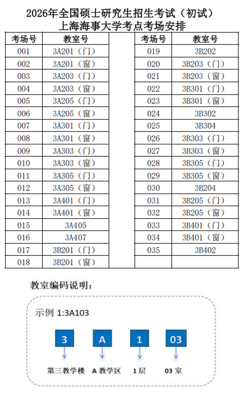 2026年全国硕士研究生招生考试(初试)将于2025年12月20日—12月21日举行。上海海事大学考点考场分布均位于上海海事大学临港校区(上海市浦东新区海港大道1550号)第三教学区。请考生根据准考证上的考场号,对照考场安排表牢记本人考场信息。