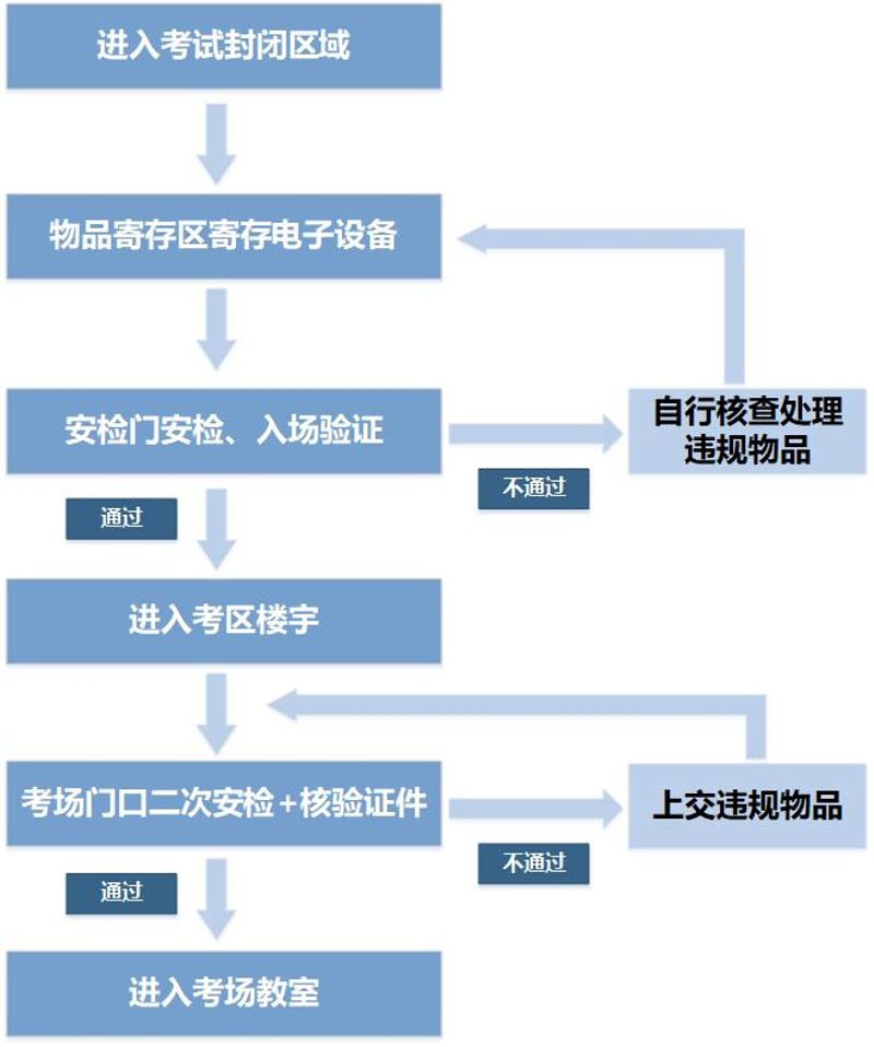 1.考生应先存放电子设备、后安检。考生将考试用品以外的个人物品存放在物品寄存区的寄存柜(请考生自行保管好寄存柜钥匙)。