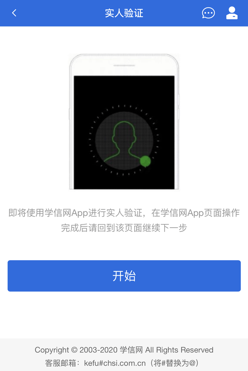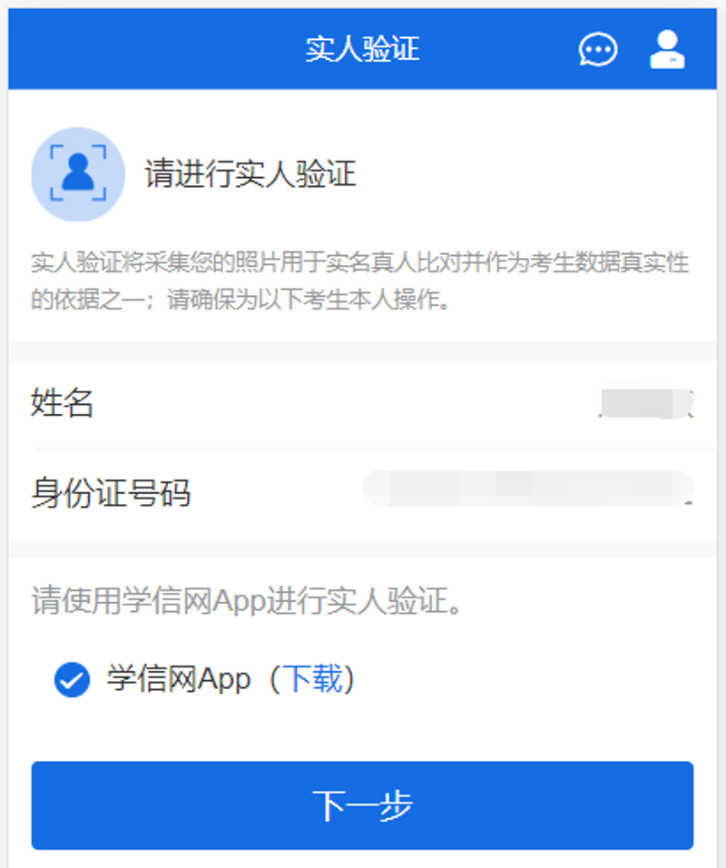 登录系统后,提示考生须进行实人验证,使用“学信网App”方式进行验证。