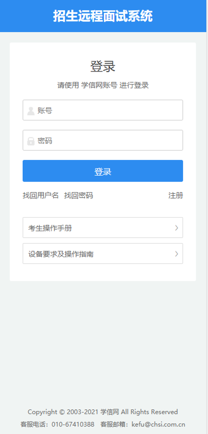 使用移动端chrome浏览器输入系统登录页面地址:https://bm.chsi.com.cn/ycms/stu/,使用学信网账号登录。请认真仔细阅读学信网用户协议和隐私政策,勾选“同意”方可进入系统。